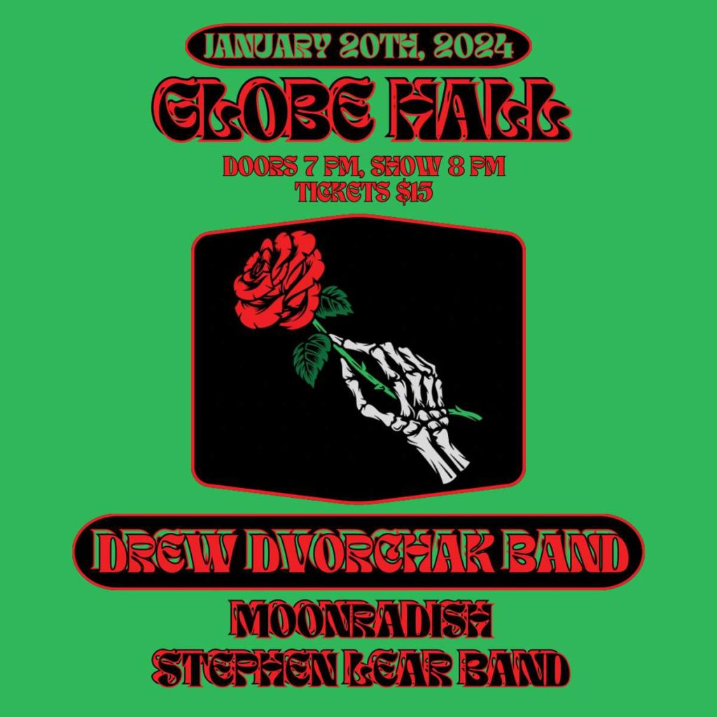 Globe Hall Presents Drew Dvorchak Band with MoonRadish and Stephen Lear Band on Saturday, January 20th. – 16+, under 16 admitted with a ticketed parent or guardian