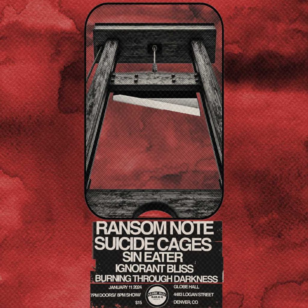 Globe Hall Presents Ransom Note with Suicide Cages, Sin Eater and Ignorant Bliss on Thursday, January 11th.- 16+, under 16 admitted with a ticketed parent or guardian