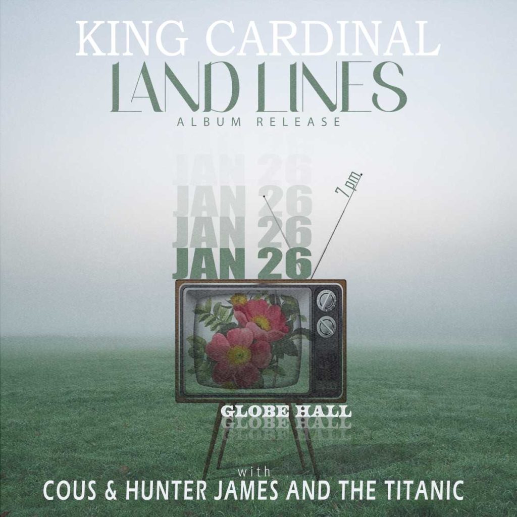 Globe Hall Presents King Cardinal with Cous and Hunter James and The Titanic on Friday, January 26th. – 16+, under 16 admitted with a ticketed parent or guardian